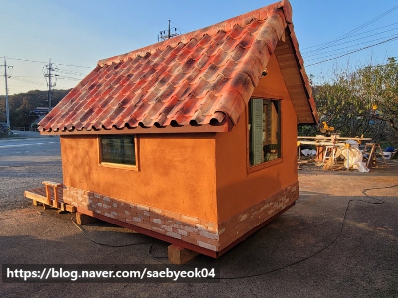 하단부의 파벽돌과 스패니시 강판 기와가 황토벽과 잘 어울리는 것 같네요.