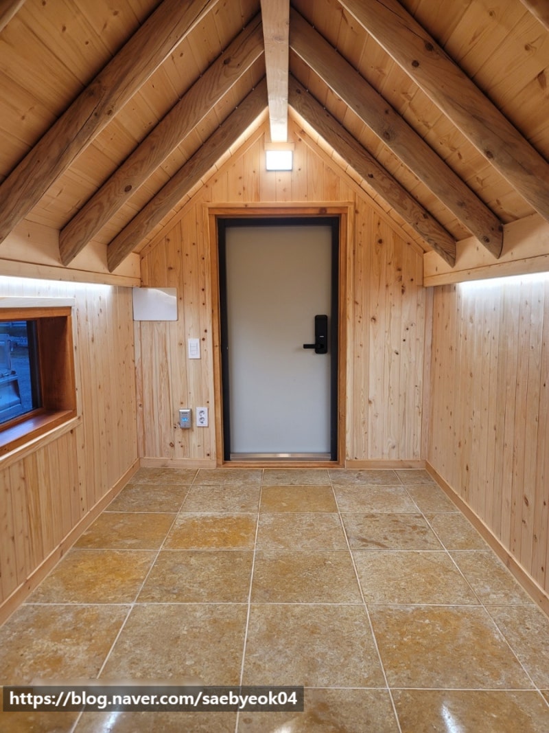 황토 미장과 황토 대리석으로 마감을 했습니다. 벽체는 편백 루바로 마감을 했습니다.