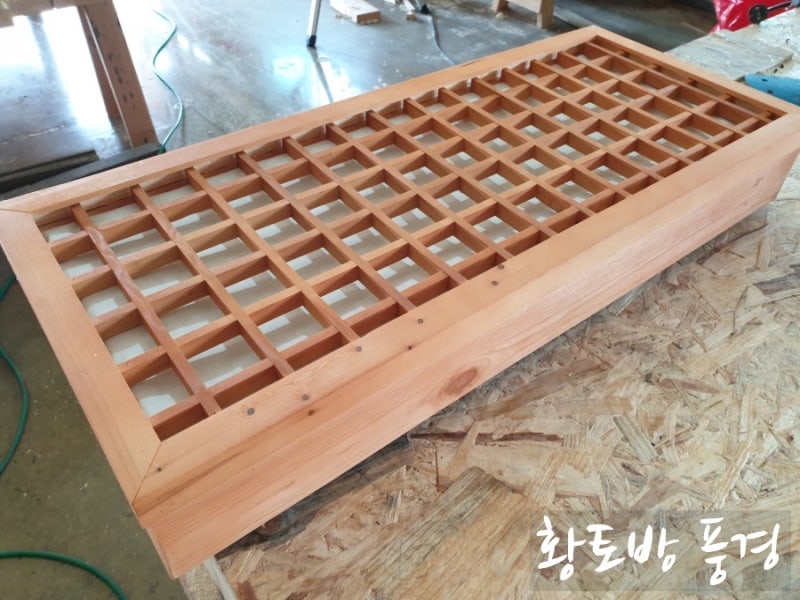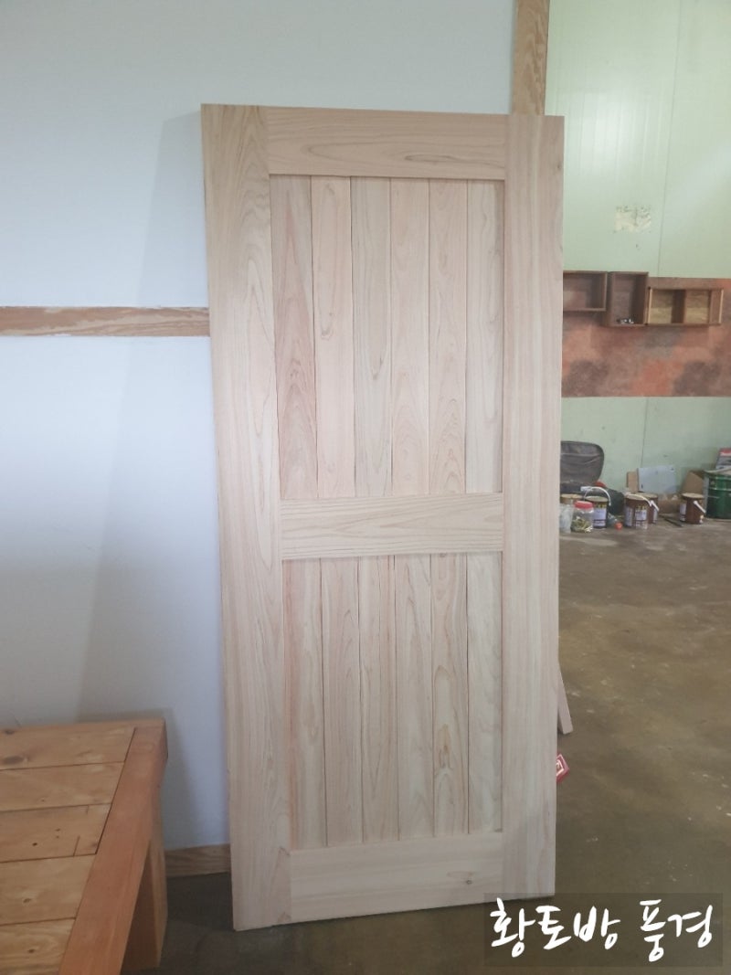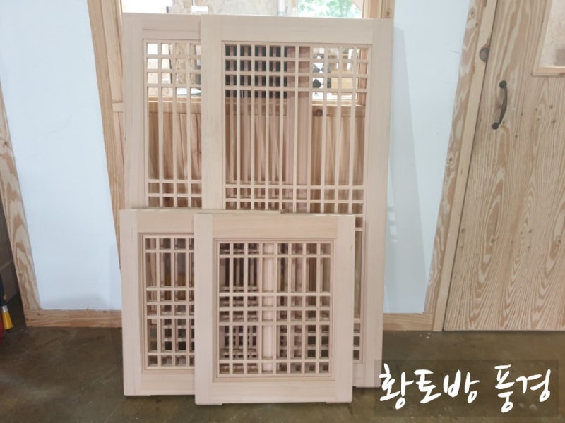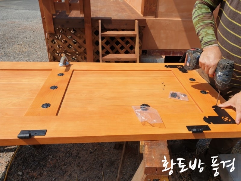 미리 주문 제작해 온 황토방 안쪽에 설치할 세살 창문과 입구에 설치할 편백나무 목문입니다.