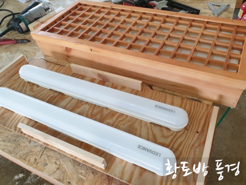 조명도 한옥 분위기에 어울리게 나무 틀을 짜서 LED 등을 달았습니다.
