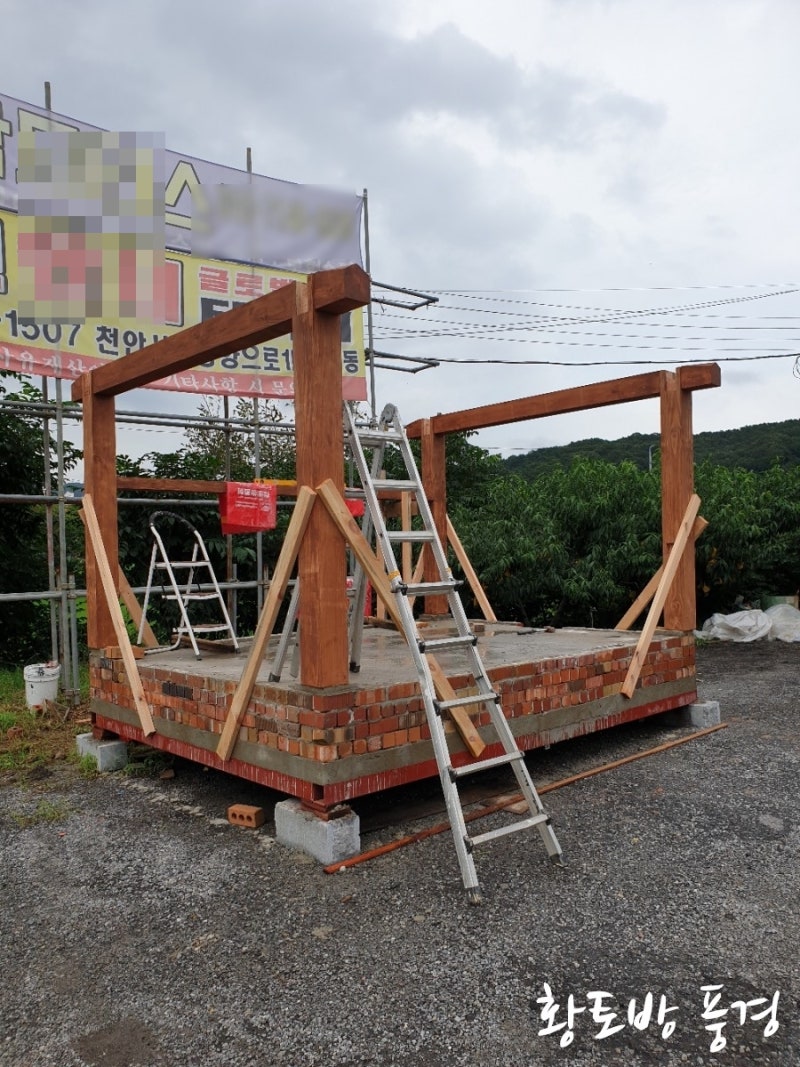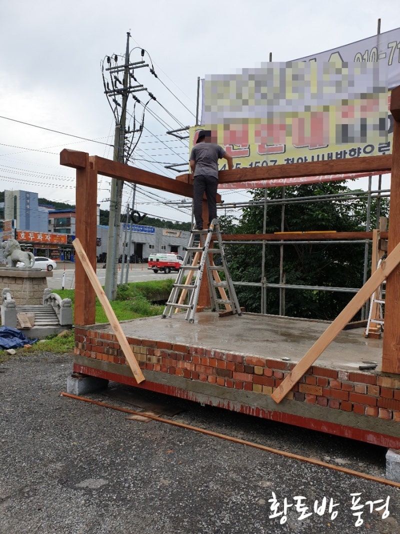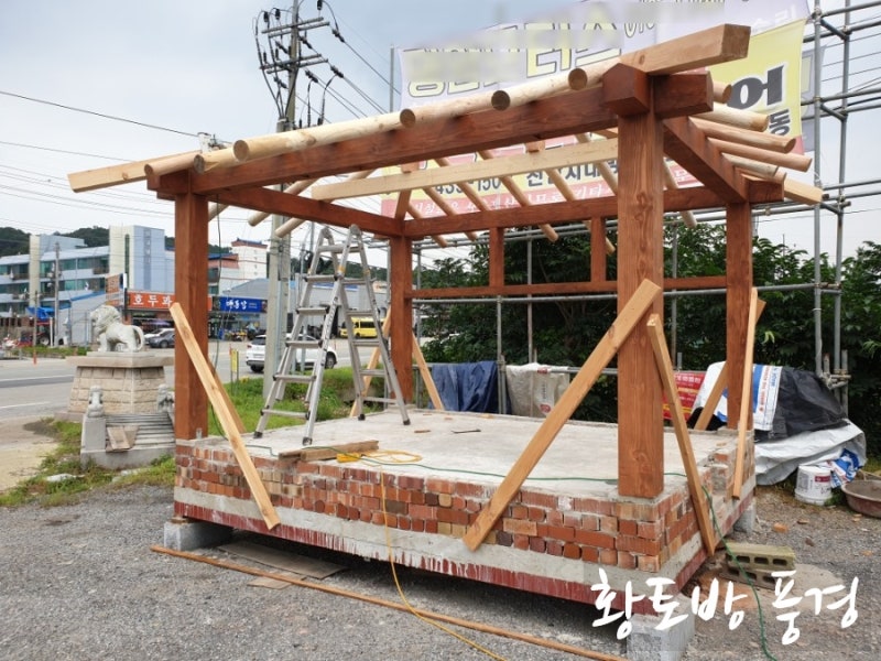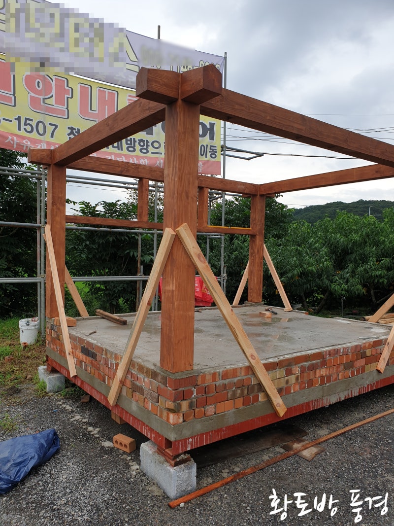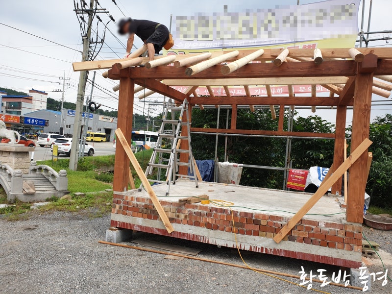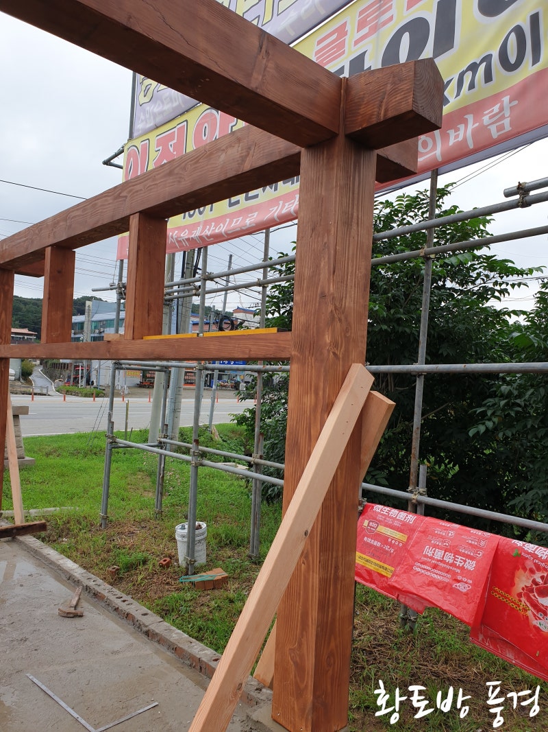 먼저 가공한 목재 기둥을 세우고 지지대를 세워 기둥 수직 수평을 잡아주고, 도리를 얹는 작업입니다.