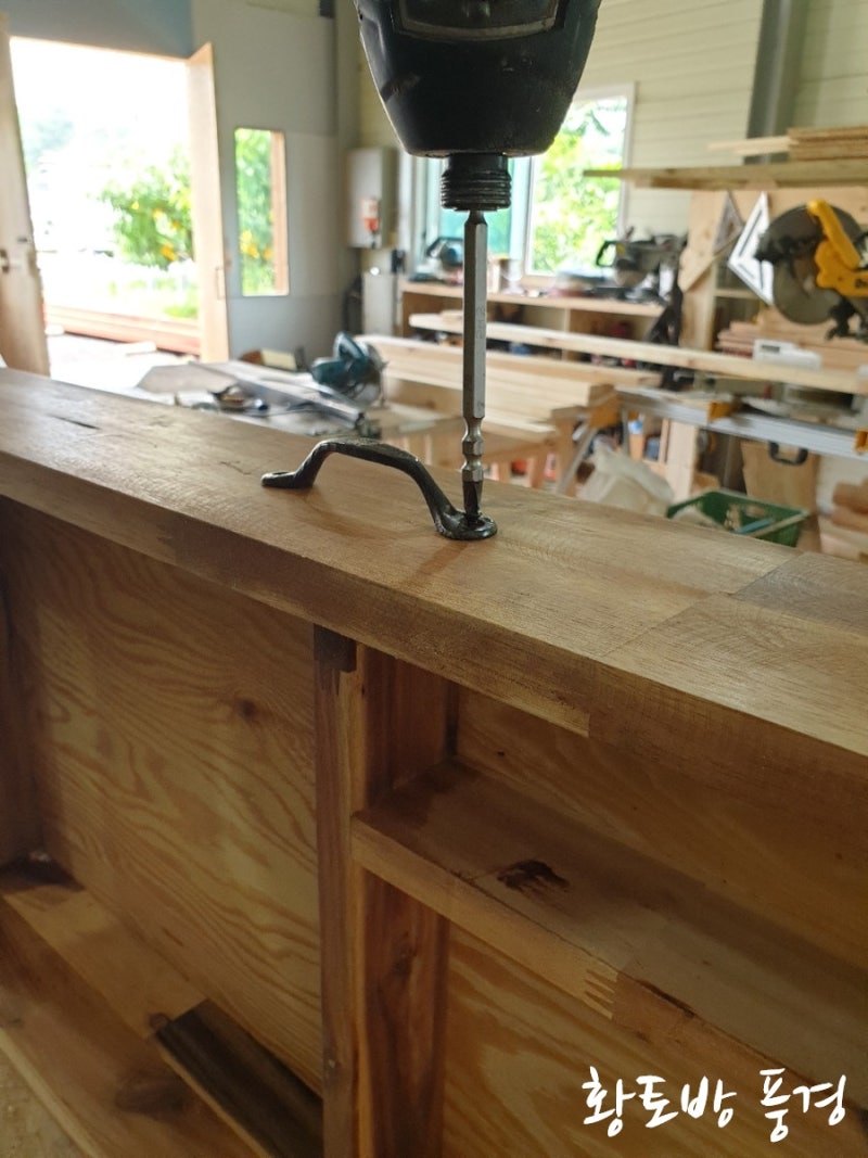 서랍에 레일을 달아 주고 주물 손잡이도 달아 주었습니다.